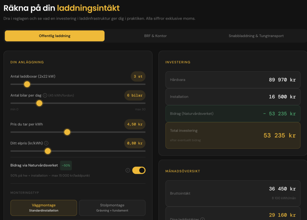 För dig som planerar att investera i laddinfrastruktur är detta ett enkelt sätt att förstå potentialen och jämföra olika upplägg innan beslut.